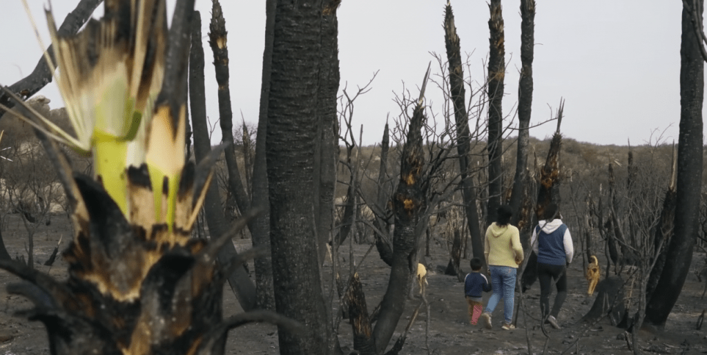 En el año 2020, los incendios en el norte de la provincia llegaron hasta Copacabana. El paisaje dejó el suelo ennegrecido y los troncos desnudos de la Caranday estirados como intentando llegar al cielo. “Comenzamos a filmar en 2020, pocos días después de los incendios. En ese momento encontramos un panorama desolador: extensas superficies arrasadas, palmas carbonizadas y una comunidad con el temor de perder su trabajo sin saber cómo seguir”, dice hoy Juan Manuel Repetto, director del documental, quien hace seis años reside con su familia en la localidad de La Cumbre.